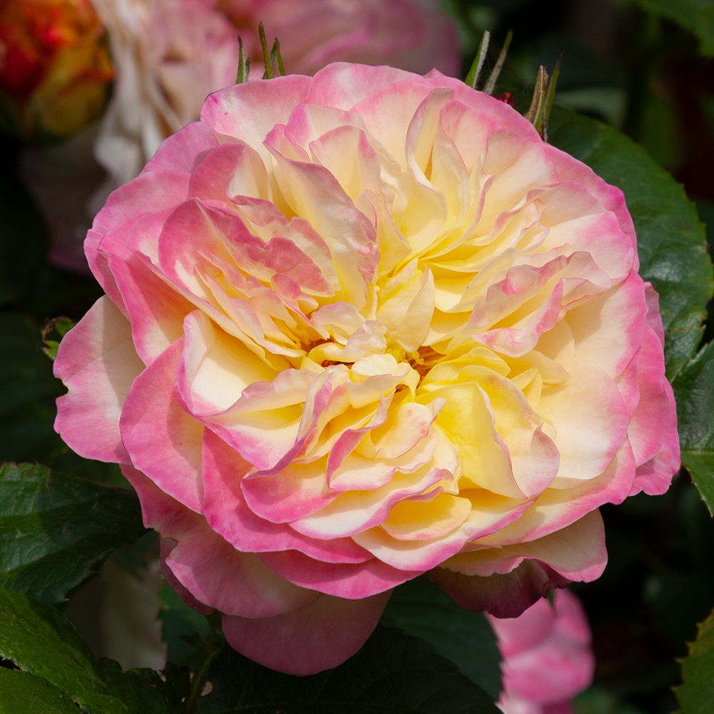 Deliciously different cream buds transform into brushed strawberry petals. Super compact, easy to grow plant with dense foliage. Repeat flowering clusters in a ripple of ruffle formed blooms. Perfect for the front of a border or planting in a pot! Bred in NZ by Bob Matthews.